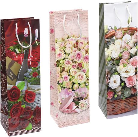 Пакет кольоровий "Пляшка" розміром 12х39х9 см. Має глянцеву поверхню та ручки-шнурки. У наборі 12 штук з різними кольорами.