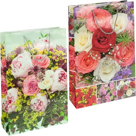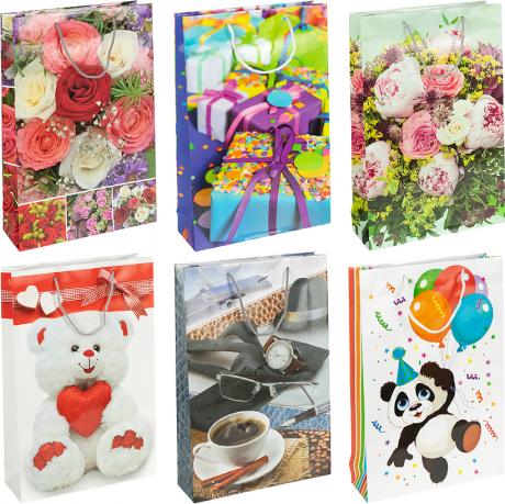 Пакет подарунковий з глянцевою поверхнею. Розміри 39х25х8 см. Має ручки-шнурки. У наборі 12 штук. Кольори в асортименті.