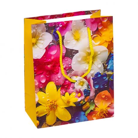 Паперовий пакет розміром 18х23х10 см, виготовлений з художнього паперу 140 г/м². Має повнокольоровий друк і матову ламінацію. Оснащений звичайною мотузковою ручкою 5 мм з поліпропілену та кліпсою. У комплекті є подарунковий ярлик. В упаковці один дизайн.