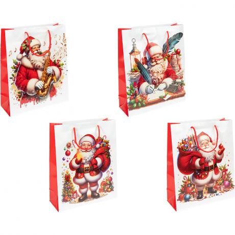 Подарунковий пакет новорічної серії розміром 18×21,5×8 см — стильне рішення для святкового пакування невеликих подарунків, солодощів і сувенірів. Виготовлений із щільного ламінованого паперу з глянцевим покриттям, стійким до вологи та пошкоджень. Яскравий дизайн із зимовими та новорічними мотивами створює атмосферу затишку та радості. Зручні шнуркові ручки забезпечують комфорт під час перенесення. В упаковці 12 штук (4 різні дизайни) — чудовий вибір для магазинів і оптових закупівель.