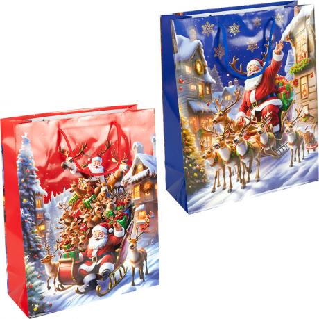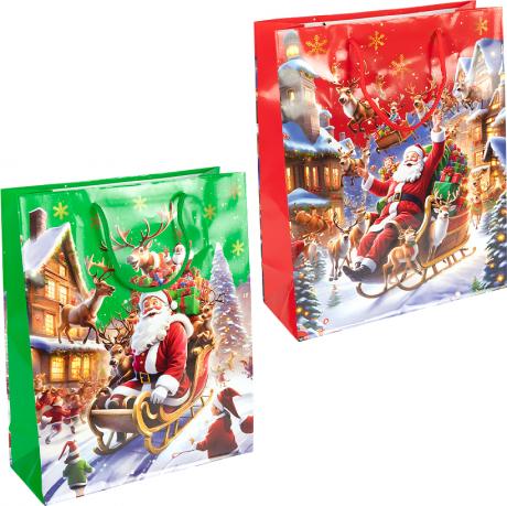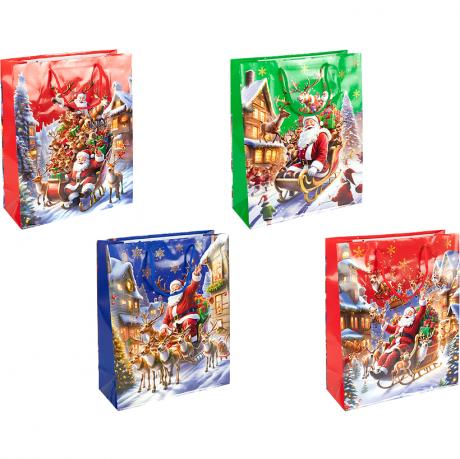 Подарунковий пакет новорічної серії розміром 18×21,5×8 см — стильне рішення для святкового пакування невеликих подарунків, солодощів і сувенірів. Виготовлений із щільного ламінованого паперу з глянцевим покриттям, стійким до вологи та пошкоджень. Яскравий дизайн із зимовими та новорічними мотивами створює атмосферу затишку та радості. Зручні шнуркові ручки забезпечують комфорт під час перенесення. В упаковці 12 штук (4 різні дизайни) — чудовий вибір для магазинів і оптових закупівель.