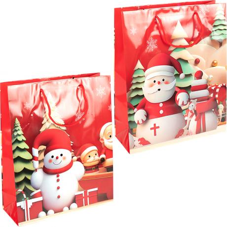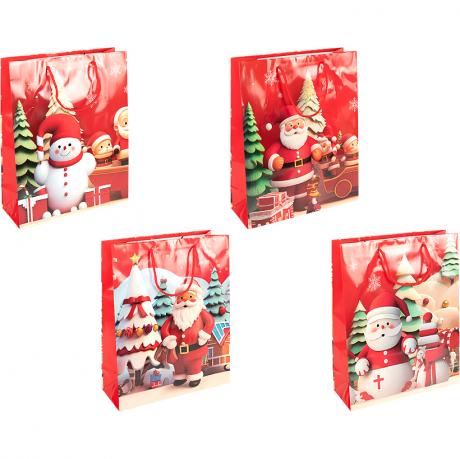 Подарунковий пакет новорічної серії розміром 18×21,5×8 см — стильне рішення для святкового пакування невеликих подарунків, солодощів і сувенірів. Виготовлений із щільного ламінованого паперу з глянцевим покриттям, стійким до вологи та пошкоджень. Яскравий дизайн із зимовими та новорічними мотивами створює атмосферу затишку та радості. Зручні шнуркові ручки забезпечують комфорт під час перенесення. В упаковці 12 штук (4 різні дизайни) — чудовий вибір для магазинів і оптових закупівель.