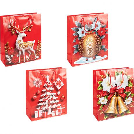 Подарунковий пакет новорічної серії розміром 18×21,5×8 см — стильне рішення для святкового пакування невеликих подарунків, солодощів і сувенірів. Виготовлений із щільного ламінованого паперу з глянцевим покриттям, стійким до вологи та пошкоджень. Яскравий дизайн із зимовими та новорічними мотивами створює атмосферу затишку та радості. Зручні шнуркові ручки забезпечують комфорт під час перенесення. В упаковці 12 штук (4 різні дизайни) — чудовий вибір для магазинів і оптових закупівель.