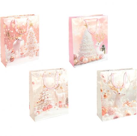 Подарунковий пакет новорічної серії розміром 18×21,5×8 см — стильне рішення для святкового пакування невеликих подарунків, солодощів і сувенірів. Виготовлений із щільного ламінованого паперу з глянцевим покриттям, стійким до вологи та пошкоджень. Яскравий дизайн із зимовими та новорічними мотивами створює атмосферу затишку та радості. Зручні шнуркові ручки забезпечують комфорт під час перенесення. В упаковці 12 штук (4 різні дизайни) — чудовий вибір для магазинів і оптових закупівель.