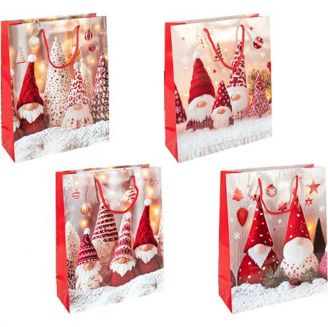 Подарунковий пакет новорічної серії розміром 26×32×10 см — універсальне рішення для святкового пакування. Виготовлений із щільного ламінованого паперу з глянцевим покриттям, стійким до вологи та пошкоджень. Яскравий дизайн із новорічними сюжетами створює атмосферу свята та чудово підходить для пакування солодощів, сувенірів і подарунків. Пакет має міцні шнуркові ручки, зручні для перенесення. В упаковці 12 штук (4 різні дизайни) — практичний варіант для роздрібного та оптового продажу.