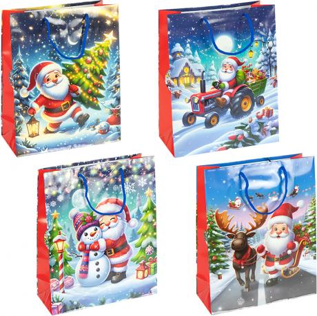 Подарунковий пакет новорічної серії розміром 32×44×11 см — універсальне рішення для святкового пакування. Виготовлений із щільного ламінованого паперу з глянцевим покриттям, стійким до вологи та пошкоджень. Яскравий дизайн із новорічними сюжетами створює атмосферу свята та чудово підходить для пакування солодощів, сувенірів і подарунків. Пакет має міцні шнуркові ручки, зручні для перенесення. В упаковці 12 штук (4 різні дизайни) — практичний варіант для роздрібного та оптового продажу.