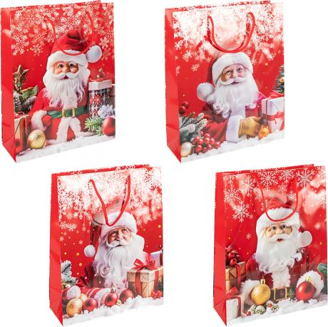 Подарунковий пакет «Новий Рік» розміром 32×44×11 см — святкова упаковка для подарунків середнього та великого розміру. Виготовлений із щільного ламінованого паперу з глянцевим покриттям, що додає блиску й захищає від вологи. На пакетах зображені яскраві новорічні сюжети з Дідом Морозом, подарунками та сніжинками. В упаковці — 12 штук (4 види дизайну). Оснащений міцними шнурковими ручками, зручними для перенесення. Ідеально підходить для пакування святкових презентів.