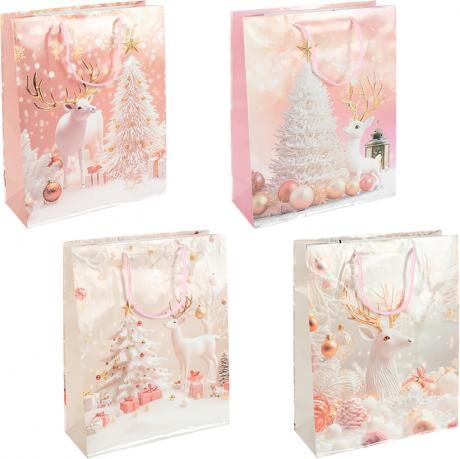 Подарунковий пакет розміром 32×44×11 см — стильна й витончена упаковка для святкових подарунків. Виготовлений із щільного ламінованого паперу з глянцевим блиском, стійкого до вологи та пошкоджень. Прикрашений зимовими сюжетами з білими оленями, ялинками та святковими кулями у ніжних пастельних відтінках. У наборі 12 штук (4 різні дизайни). Пакети мають міцні атласні шнуркові ручки для зручного перенесення. Ідеально підходять для пакування подарунків, сувенірів і новорічного декору.