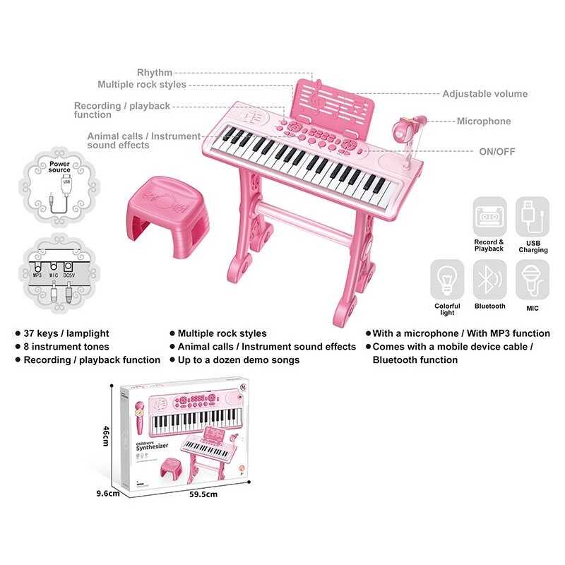 - Піаніно 6655 (8) 37 клавіш, стілець, мікрофон, вбудований акумулятор, Bluetooth, звуки тварин та музичних інструментів, мелодії, 3 AUX-роз'єми, AUX-кабель, USB-AUX кабель, регулювання гучності, функція запису, в коробці
