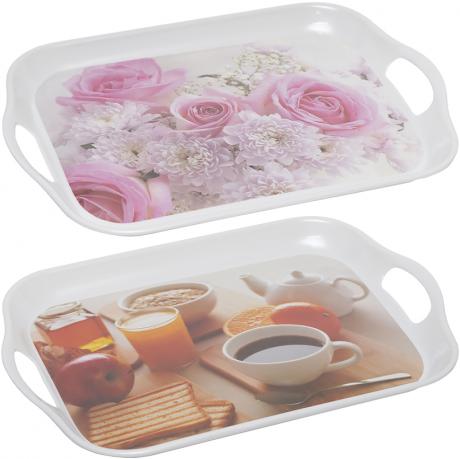 Піднос з ручками, розміром 40*28*3см, виготовлений з меламіну. Має яскравий малюнок. Перед придбанням рекомендується перевірити цілісність товару на пошті.