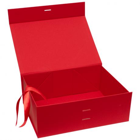 Подарункова складна коробка зі стрічкою призначена для оформлення подарунків та презентаційної упаковки. Розмір у зібраному вигляді — 28,2×20,2×9,2 см. Розмір в упаковочному пакеті — 38х28 см. Коробка червоного матового кольору. Кришка фіксується за допомогою магнітів і додатково оформлена стрічкою, яка акуратно протягується через спеціальні отвори та з’єднує кришку з коробкою, забезпечуючи надійне закриття й охайний вигляд. Конструкція складна, кути фіксуються за допомогою вже нанесеної двосторонньої клейкої стрічки, що гарантує міцність форми та зручність складання. Товар вигідний для оптових магазинів і підходить для роздрібного продажу.