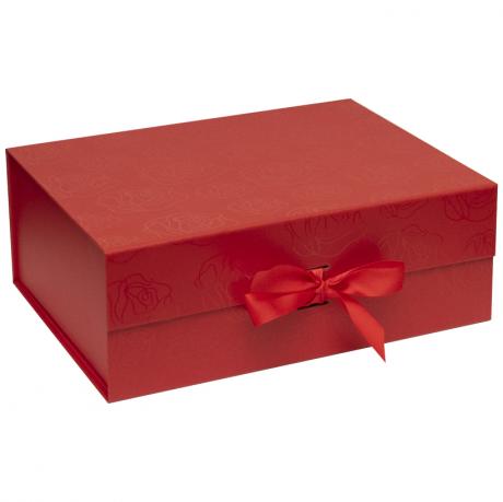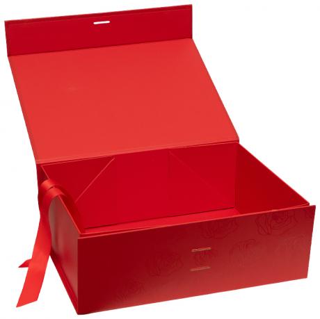 Подарункова складна коробка зі стрічкою призначена для оформлення подарунків та презентаційної упаковки. Розмір у зібраному вигляді — 28,2×20,2×9,2 см. Розмір в упаковочному пакеті — 38×28 см. Коробка червоного матового кольору, поверхня оздоблена УФ-друком із високою стійкістю до зношування. Кришка фіксується за допомогою магнітів і додатково оформлена стрічкою, яка акуратно протягується через спеціальні отвори та з’єднує кришку з коробкою, забезпечуючи надійне закриття й охайний вигляд. Конструкція складна, кути фіксуються за допомогою вже нанесеної двосторонньої клейкої стрічки, що забезпечує міцність форми та зручність складання. Товар вигідний для оптових магазинів і підходить для роздрібного продажу.