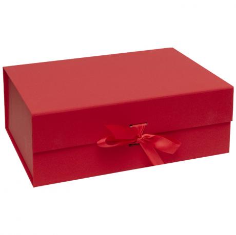 Подарункова складна коробка зі стрічкою призначена для оформлення подарунків та презентаційної упаковки. Розмір у зібраному вигляді — 33×25×12 см. Розмір в упаковочному пакеті — 48,8×33 см. Коробка червоного матового кольору. Кришка фіксується за допомогою магнітів і додатково оформлена стрічкою, яка акуратно протягується через спеціальні отвори та з’єднує кришку з коробкою, забезпечуючи надійне закриття й охайний вигляд. Конструкція складна, кути фіксуються за допомогою вже нанесеної двосторонньої клейкої стрічки, що гарантує міцність форми та зручність складання. Товар вигідний для оптових магазинів і підходить для роздрібного продажу.
