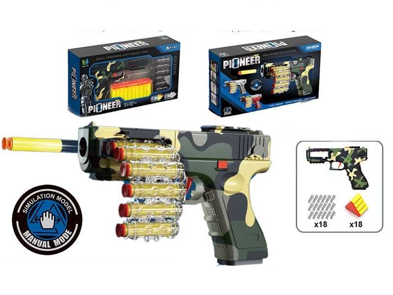 - Пістолет 009 B (48/2) стріляє м’якими патронами, механічний принцип роботи, кульова стрічка, 20 патронів, в коробці