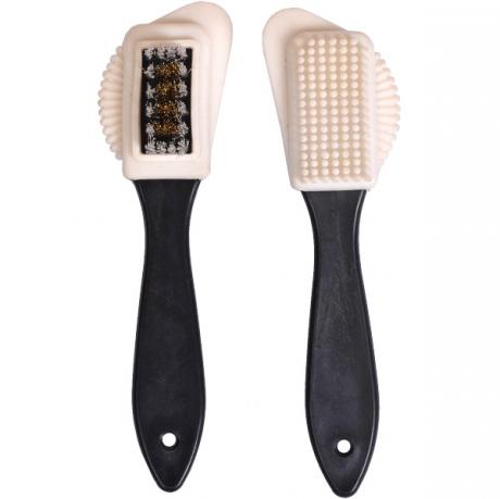 Щітка для взуття підходить для замші та нубуку. Має чотири робочі сторони. Ворс виготовлений з гуми та латуні. Рукоятка з пластику. Розмір щітки: 16х3х3 см.