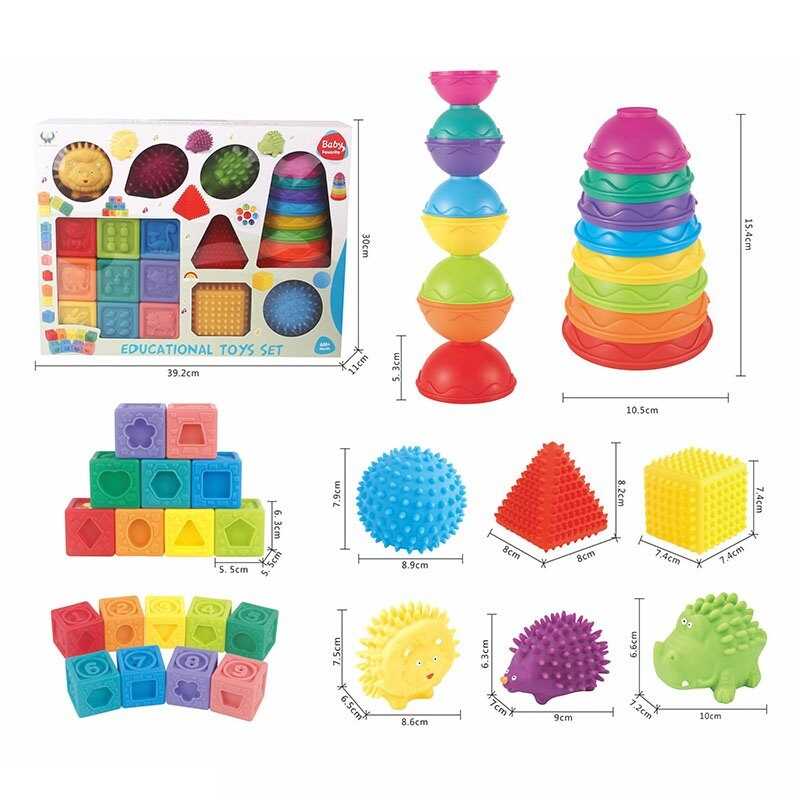 - Сенсорні іграшки 628-164 (12/2) кубики, м’ячики, пірамідка та фігурки, в коробці