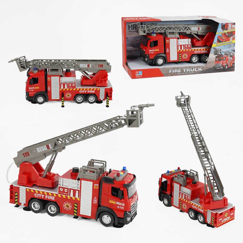- Спецтехніка 8181-1 (24/2) “Пожежна машина”, звук, підсвічування, помпове накачування води, висувна драбина, інерція, платформа з тріскачкою, в коробці