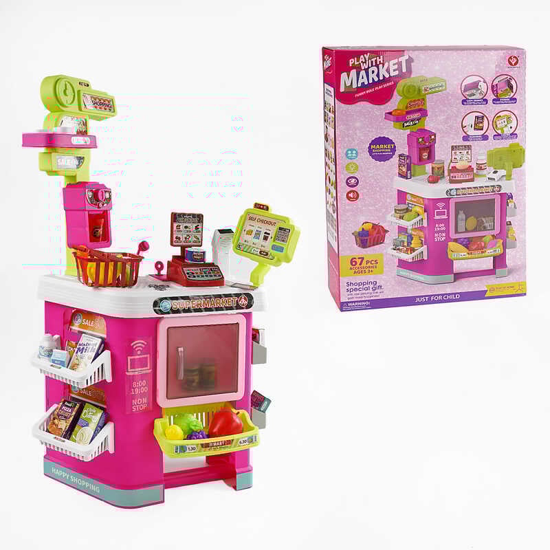 - Супермаркет 922-199 (8) 67 елементів, звук, підсвічування, касовий апарат, сканер, ваги, купюри, монети, продукти, кошик, в коробці