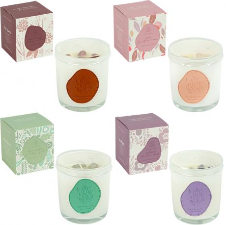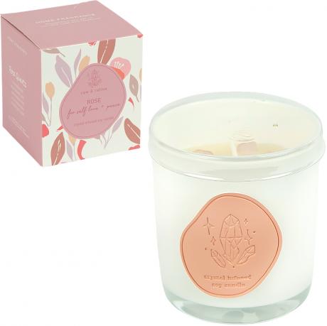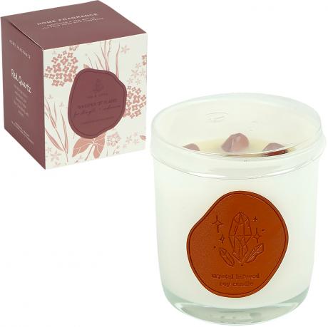 Свічка ароматична оснащена прозорою кришкою для збереження аромату та акуратного зберігання. Вага виробу — 450 г. Розмір стакана 9×7,5 см. У соєвому воску декоративно розміщені кристали, що надають свічці особливої естетики та роблять її привабливою для подарункових наборів.