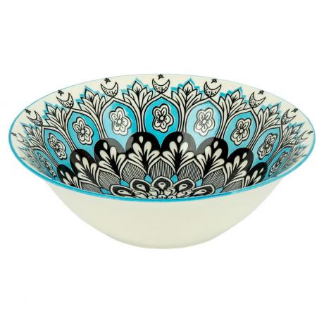 Тарілка з яскравим східним орнаментом на блакитному тлі, діаметром 17 см, висотою 7,5 см та об’ємом 500 мл. Декор виконано у вигляді чорно-білих квіткових і геометричних візерунків, що створюють ефект мандали. Блакитний фон додає свіжості та легкості, роблячи тарілку яскравим акцентом на столі. Підходить для подачі закусок, салатів, десертів та гарнірів.