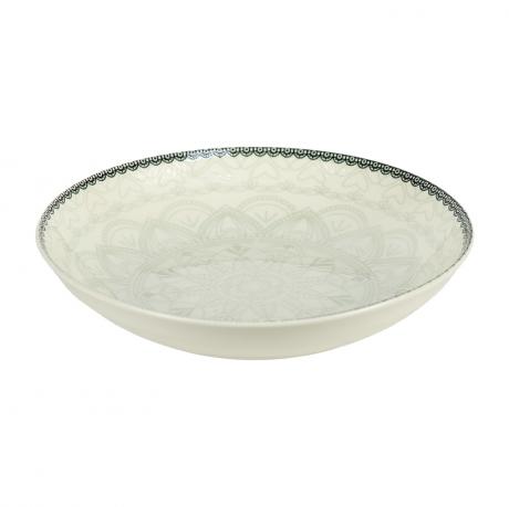 Керамічна тарілка діаметром 18 см і висотою 5 см, об’єм 300 мл. Дизайн виконаний у спокійних світло-бежевих і сірих відтінках з витонченим орнаментом у стилі мандала в центрі та тонким контрастним узором по краю. Виготовлена з міцної кераміки з гладким глянцевим покриттям. Підходить для подачі супів, салатів, каш, гарнірів та інших страв. Універсальний елегантний дизайн пасує як для щоденного, так і для святкового сервірування.