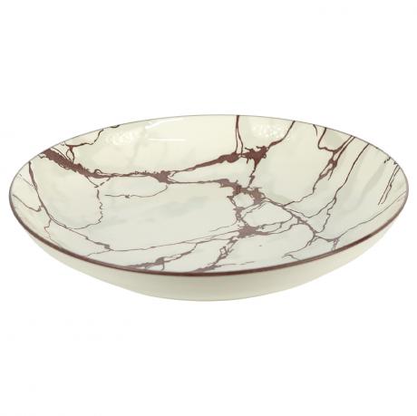 Керамічна тарілка універсального призначення діаметром 20,5 см і висотою 5,5 см, об’єм 500 мл. Виготовлена з міцної кераміки кремового кольору та оздоблена стильним мармуровим візерунком з виразними прожилками у бордово-коричневих тонах. Лаконічний і сучасний дизайн робить тарілку універсальною для будь-якого сервірування — як щоденного, так і святкового. Підходить для подачі супів, салатів, пасти, каш, гарнірів і других страв.