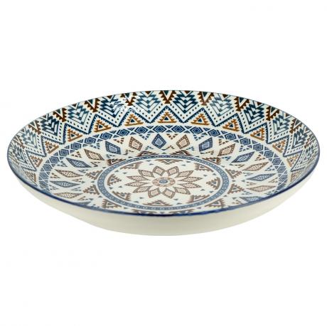 Керамічна тарілка універсального призначення діаметром 20,5 см і висотою 5,5 см, об’єм 500 мл. Виготовлена з міцної кераміки кремового кольору та оздоблена виразним геометричним орнаментом в етнічному стилі з поєднанням синіх і коричневих відтінків. Така тарілка стане стильним акцентом сервірування та підійде як для щоденного використання, так і для святкового столу. Чудово підходить для подачі супів, салатів, пасти, гарнірів і других страв.