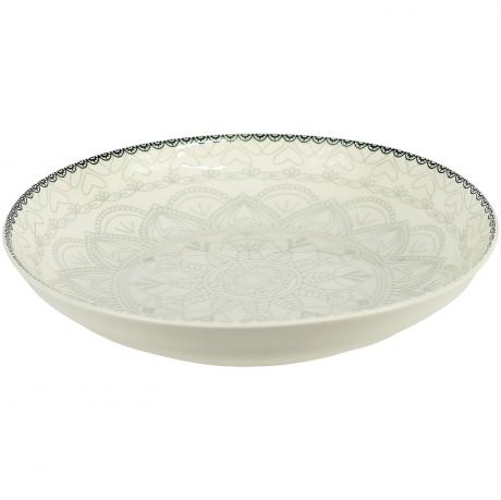 Керамічна тарілка 9-ка з узором, діаметр 23 см, висота 6,5 см, об’єм 700 мл. Виготовлена з міцної кераміки кремового кольору та оздоблена вишуканим орнаментом у стилі мандали. Глибока форма зручна для подачі супів, пасти, салатів і других страв. Підходить для щоденного використання та стильного сервірування столу.