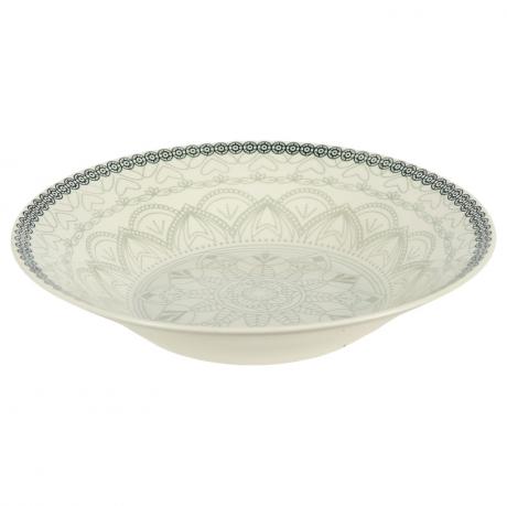 Супова керамічна тарілка діаметром 20 см та висотою 6 см, об’єм 500 мл. Дизайн виконаний у ніжній гамі з витонченим сірим мандаловим орнаментом у центрі та акуратною декоративною окантовкою по краю. Симетричний орнамент надає тарілці елегантного та універсального вигляду, що гармонійно поєднується з будь-яким сервіруванням. Виготовлена з міцної кераміки з гладким глянцевим покриттям, підходить для щоденного використання. Чудово підходить для подачі супів, бульйонів, крем-супів, пасти та інших страв.