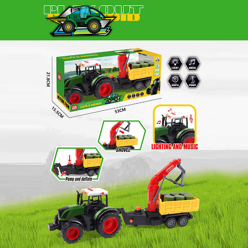 - Трактор 687-149 B (18/2) довжина: 50 см, причеп - самоскид, кран, інерція, підсвічування, звук, помповий підіймач, вантаж, капот підіймається, в коробці