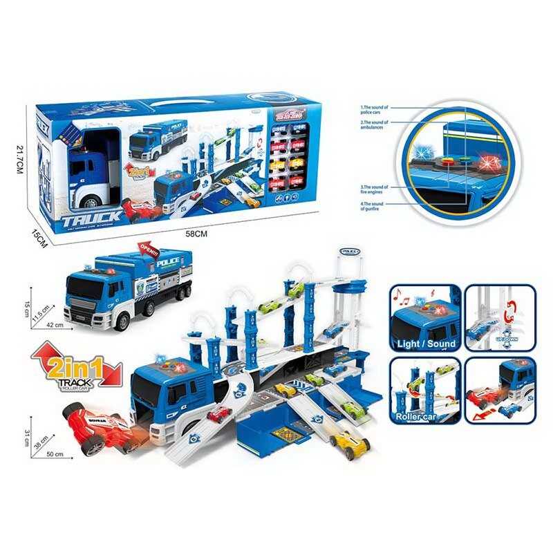 - Трек 660 S-17 (12/2) ”Поліція”, розмір: 50х38х31 см, вантажівка, інерція, підсвічування, звуки, 8 моделей машин, довжина: 4 см, наліпки, в коробці