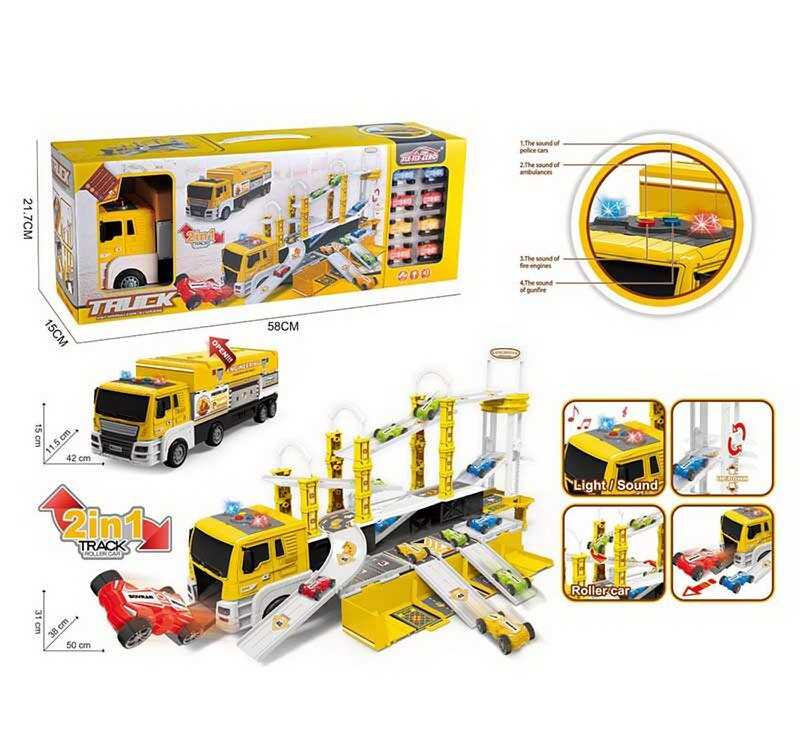 - Трек 660 S-19 (12/2) "Спецтехніка", розмір: 50х38х31 см, вантажівка, інерція, підсвічування, звуки, 8 моделей машин, довжина: 4 см, наліпки, в коробці