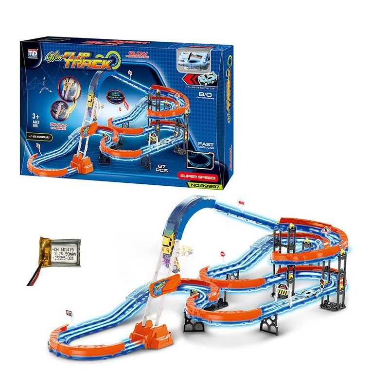 Трек 89997 (18) 87 елементів, машинка із вбудованим акумулятором, підсвічування, світиться у темряві, трюки, муляжі оточення, в коробці