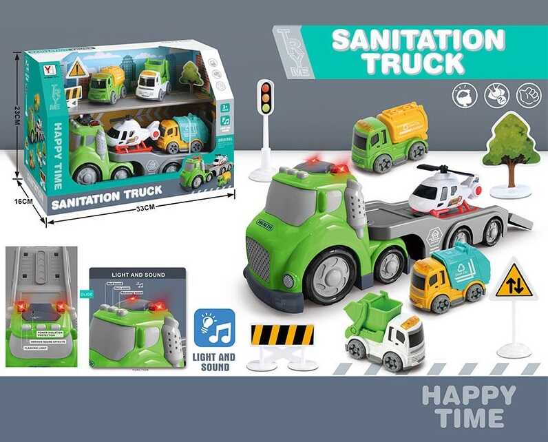 - Трейлер 98-333 A (24/2) 3 машинки, інерція, гелікоптер, муляжі оточення, звуки, підсвічування, в коробці