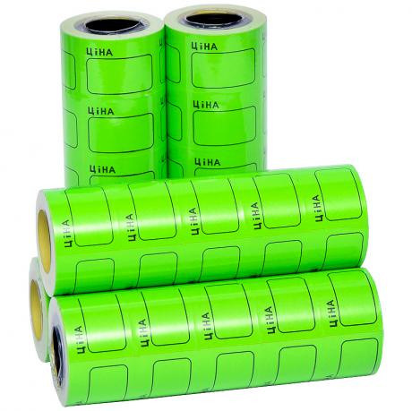 Цінники зеленого кольору з написом "Ціна" українською мовою. Розмір кожного цінника - 2,5х3,5 см. В одній упаковці - 100 штук, розподілених на 5 бобін. Ціна вказана за одну упаковку.