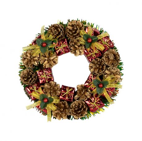 Різдвяний вінок діаметром 22 см — стильна прикраса для святкового інтер’єру. Виготовлений із міцного картону та оздоблений шишками, подарунковими коробочками, стрічками та зеленими елементами, що створюють атмосферу тепла й затишку. Легкий і охайний, вінок можна повісити на двері, стіну або використати як настільну прикрасу. Постачається у прозорій упаковці, зручній для зберігання та транспортування. Ідеально підходить для новорічного декору дому, офісу, вітрини чи святкової композиції.
