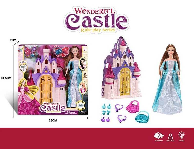 - Замок з лялькою KDL 57 (36/2) висота ляльки: 30 см, шарнірні з'єднання, знімна сукня, аксесуари, розмір замка: 20х32, звук, підсвічування, відчиняються дверцята, в коробці