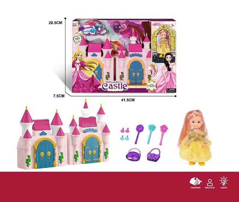 - Замок з лялькою KDL 58 (36/2) висота ляльки: 10 см, шарнірні з'єднання, знімна сукня, аксесуари, розмір замка: 30х18, мелодія, підсвічування, відчиняються дверцята, в коробці
